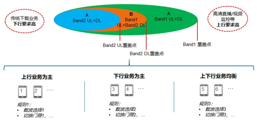 语音业务对无线带宽的要求较低,系统将智能选择低频段广覆盖、小带宽且具有上下行对称优势的网络承载语音业务;而对于需求上行高速数据的业务,需要更大的带宽来满足快速传输的需求,此时系统将智能选择高频段、大带宽的网络以保障用户的优质体验。