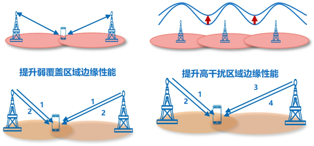 CoMP多点协同,可以通过多小区间的干扰协同来实现同频组网和小区间干扰的抑制或消除,多小区为一个终端的数据传输服务或者联合接收一个终端发送的数据。多点协同方式包括JR(联合接收)、JT(联合发送)、CBF(联合波束赋形)和CS(协同调度)。CoMP多点协同技术实现小区间收发协同,变干扰信号为有用信号,提升网络性能和用户上下行速率,尤其边缘用户感知得到显著改善。