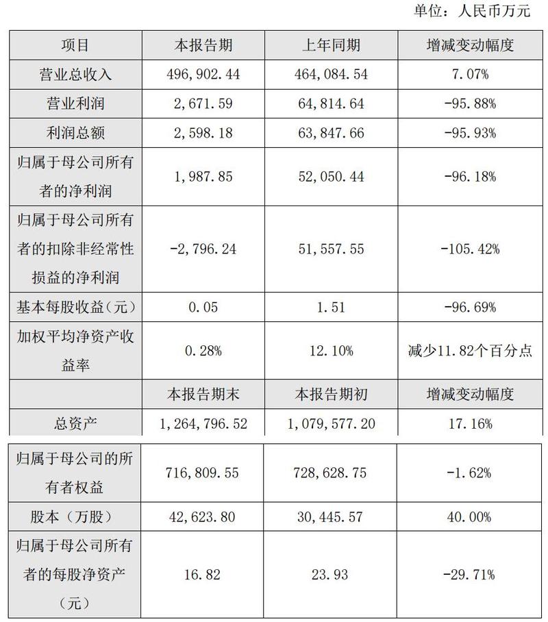 2、报告期内,基本每股收益较上年同期减少96.69%,加权平均净资产收益率较上年同期减少11.82个百分点,主要系归属于上市公司股东的净利润较上年同期下降,及报告期内公司实施2022年年度权益分派,以资本公积金向全体股东每股转增0.4股使公司股本从30,445.57万股增加至42,623.80万股所致。