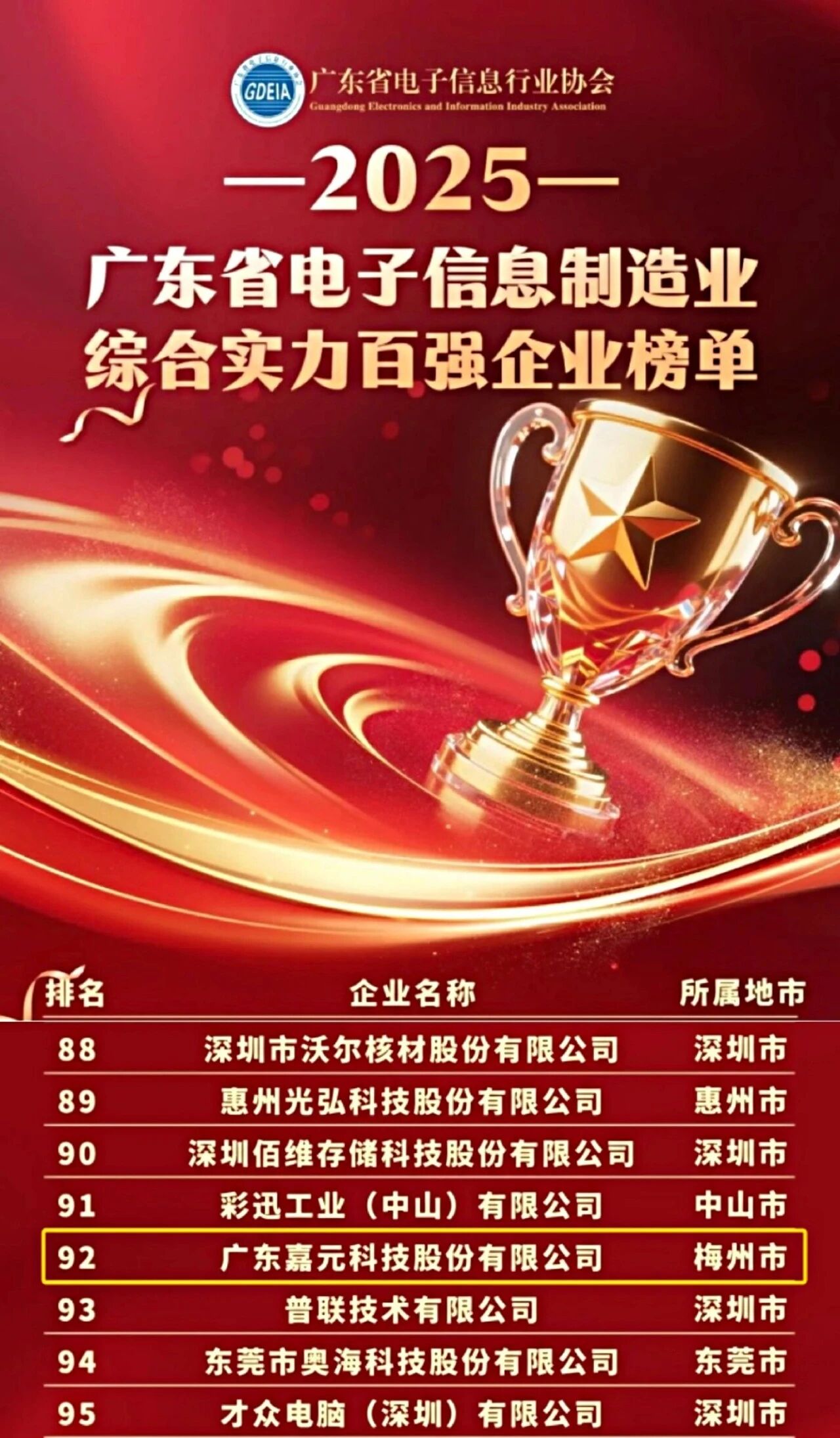 近日,广东省电子信息行业协会正式发布了“2025年广东省电子信息制造业综合实力百强企业”榜单,嘉元科技凭借在高端铜箔研发制造领域的硬核实力与稳健增长的经营业绩入选,位列第92名。