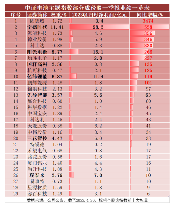 从Q1归母净利润的角度来看,固德威同比高增近35倍领跑,第一大权重股宁德时代同比增长超5倍次之,派能科技、德业股份、科士达同比增长超3倍紧随其后,前十大权重股阳光电源同比高增266%,均胜电子同比大增227%,前十大权重股国轩高科同比增长135%,杭可科技同比大增125%,前十大权重股亿纬锂能同比增长119%,鹏辉能源同比增长超100%……