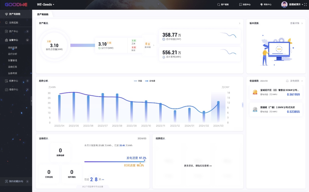 除了硬件设施之外,此电站项目还接入了固德威智慧能源WE平台,WE平台具有账单自动结算、功率因数优化、组串电流低告警、视频监控等满足电站管理核心需求的各项功能,解决工商业分布式光伏长达20多年运营管理中的各类痛点,助力电站资产保值、增值。