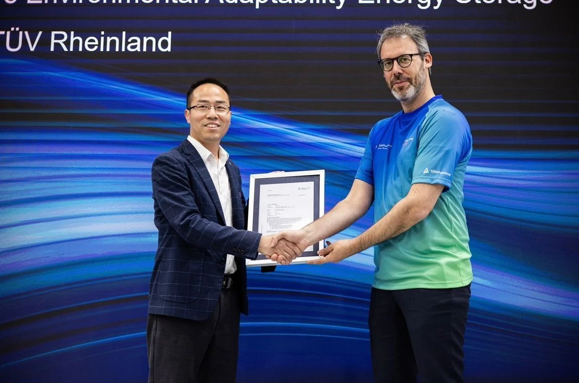作为固德威安全承诺的印证,ESA125kW/261kWh 工商业储能一体柜凭借卓越的环境适应性获得德国莱茵 TüV 认证,在发布会期间举行了颁奖仪式。