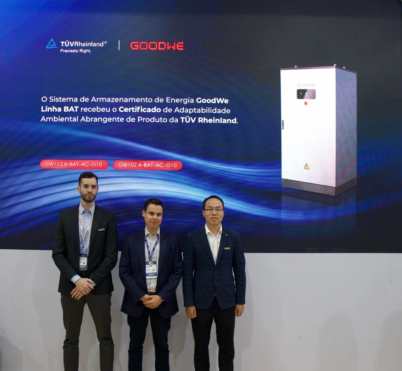 在展会现场,德国莱茵TüV集团向固德威颁发了BAT系列储能产品的环境适应性认证证书,固德威副总经理潘冬华博士在现场接受颁奖。该认证为国际权威认可,充分印证了固德威BAT系列储能系统在极端环境条件——包括高温、极寒、高湿、盐雾及强烈振动等严苛场景下,仍保持稳定、安全与高效的卓越性能。这一认证不仅体现了固德威在产品设计与制造方面的高标准与可靠性,也为客户在全球复杂环境下的储能应用提供了坚实保障。