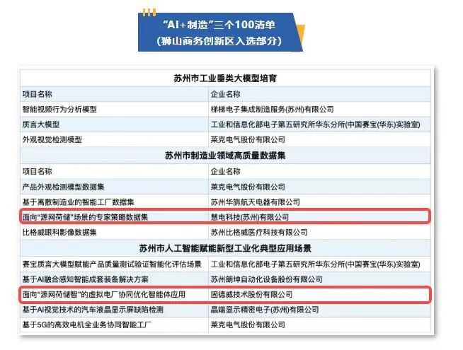 其中,固德威技术股份有限公司以项目“面向‘源网荷储智’的虚拟电厂协同优化智能体应用”入选苏州市人工智能赋能新型工业化典型应用场景;固德威集团慧电科技以“面向‘源网荷储’场景的专家策略数据集”入选苏州市制造业领域高质量数据集。