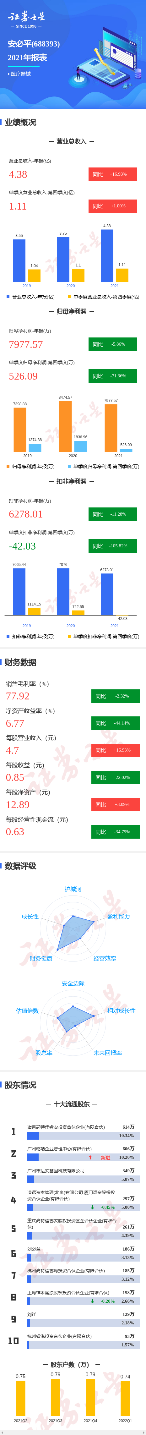 安必平2021年报显示,公司主营收入4.39亿元,同比上升16.93%;归母净利润7977.58万元,同比下降5.86%;扣非净利润6278.01万元,同比下降11.28%;其中2021年第四季度,公司单季度主营收入1.12亿元,同比上升1.0%;单季度归母净利润526.09万元,同比下降71.36%;单季度扣非净利润-42.03万元,同比下降105.82%;负债率11.42%,投资收益674.25万元,财务费用-1179.46万元,毛利率77.92%。