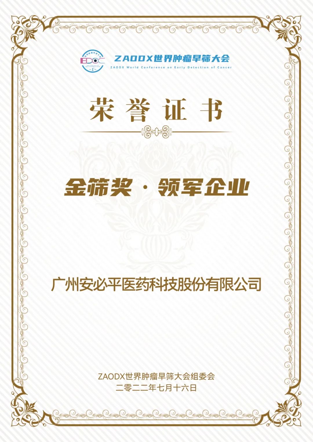 7月15日至17日,肿瘤早筛行业盛会ZAODX世界肿瘤早筛大会在广州举行,安必平荣获金筛奖?领军企业奖。