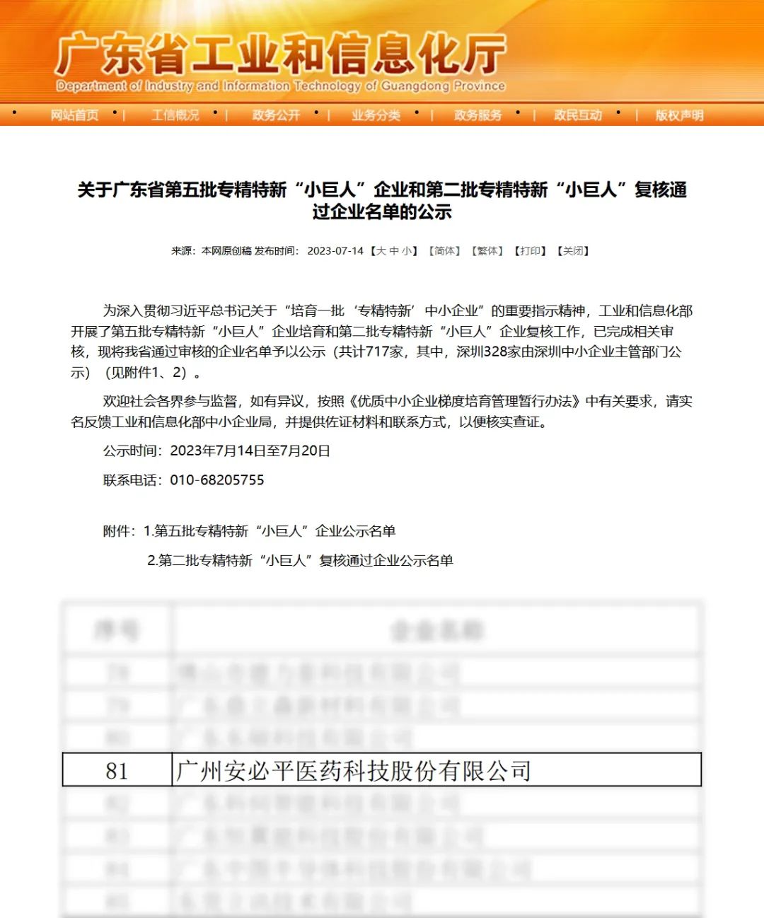 近日,广东省工业和信息化厅下发了《关于广东省第五批专精特新“小巨人”企业和第二批专精特新“小巨人”复核通过企业名单的公示》,安必平凭借专业技术实力、创新研发能力以及市场领导地位顺利通过了此次严格审核,成功入选为第五批专精特新“小巨人”企业。
