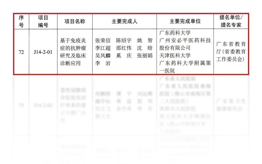 近日,广东省人民政府正式公布了2022年度广东省科学技术奖获奖项目。广东药科大学、天津医科大学、广东药科大学附属第一医院和广州安必平医药科技股份有限公司联合申报的项目《基于免疫炎症的抗肿瘤研究及临床诊断应用》荣获广东省科技进步奖二等奖。