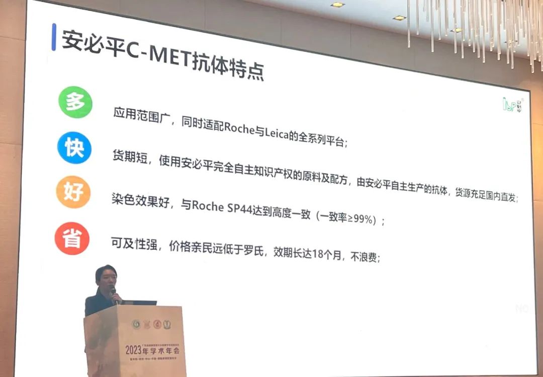 在卫星会环节,安必平IHC产品部汪朦经理介绍了安必平C-MET抗体。MET抑制剂治疗根据以往的治疗指南,一般被列为在EGFR/ALK抑制剂一线治疗后的二线治疗;根据近些年的大量临床研究,C-MET蛋白过表达病人亦能够从赛沃替尼治疗中受益,且该类人群与基因突变人群不具有较大的重合性;因此临床检测C-MET蛋白表达(免疫组织化学法),能够增加赛沃替尼或其它MET抑制剂的获益人群;2023年11月公布了最新的《非小细胞肺癌MET免疫组化检测和判读标准中国专家共识》赛沃替尼临床研究中使用的MET IHC检测推荐Ventana MET(SP44),安必平自研C-MET抗体与指南推荐抗体SP44检测一致率 99%,能够做到“多、快、好、省”,满足使用要求。