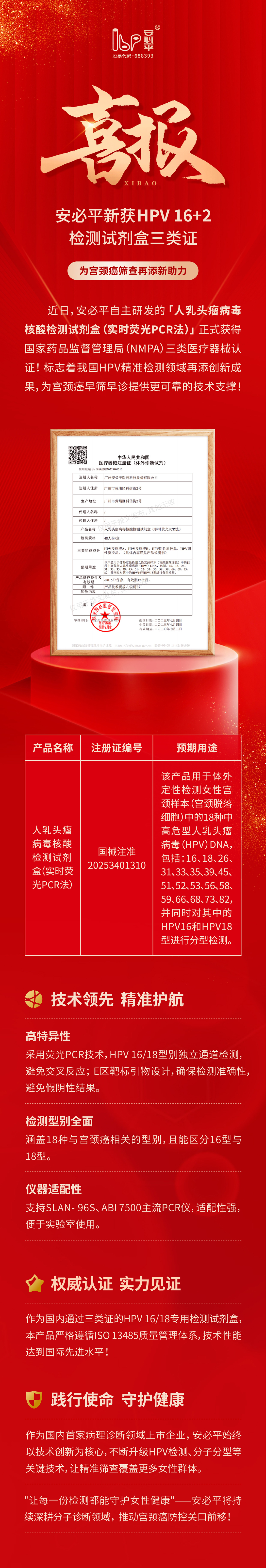 喜报 | 安必平HPV16+2检测试剂盒获批国家三类医疗器械证