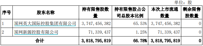 国家电网旗下上市公司国网英大2月28日有38.19亿股定增限售股上市流通,占总股本的66.78%,是解禁前流通盘的2倍,解禁市值195.90亿元。此轮解禁后,公司实现全流通。