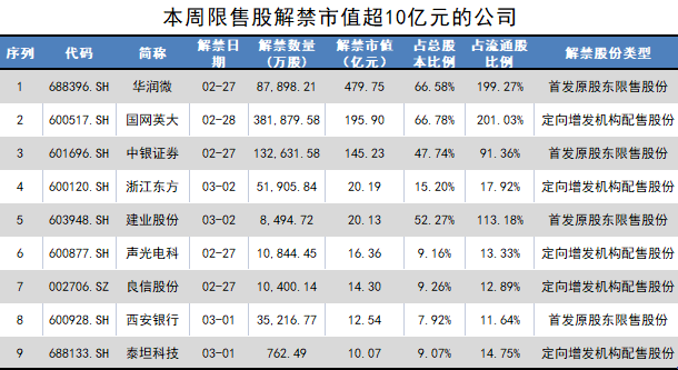 解禁市值超过10亿元的公司有9家,前三分别为华润微(688396.SH)、国网英大(600517.SH)、中银证券(601696.SH),解禁市值均超过100亿元。本周解禁数量超过1亿股的公司有9家,前三同样是上述三家公司。