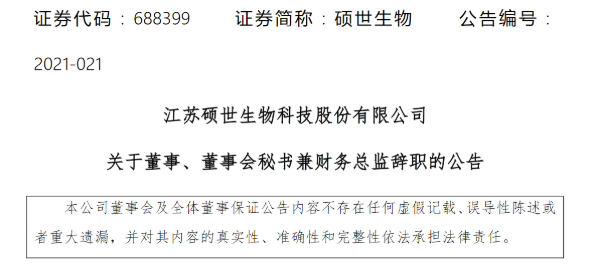 6月23日,硕世生物发布公告称,近日收到了公司董事、董事会秘书兼财务总监吴青谊提交的书面辞呈。