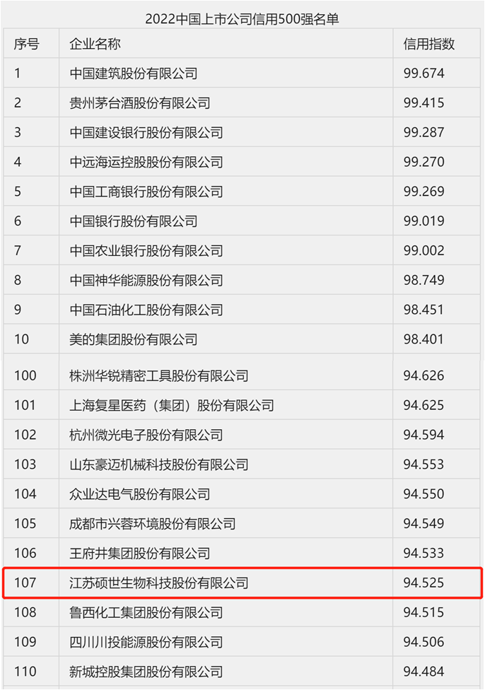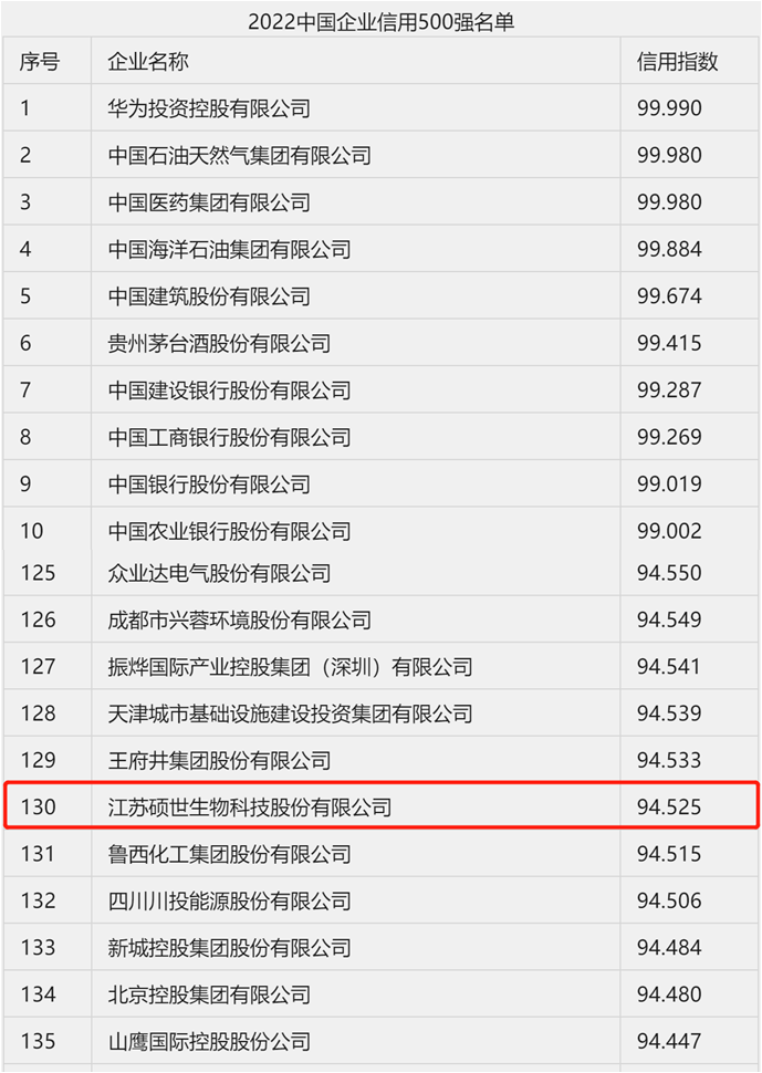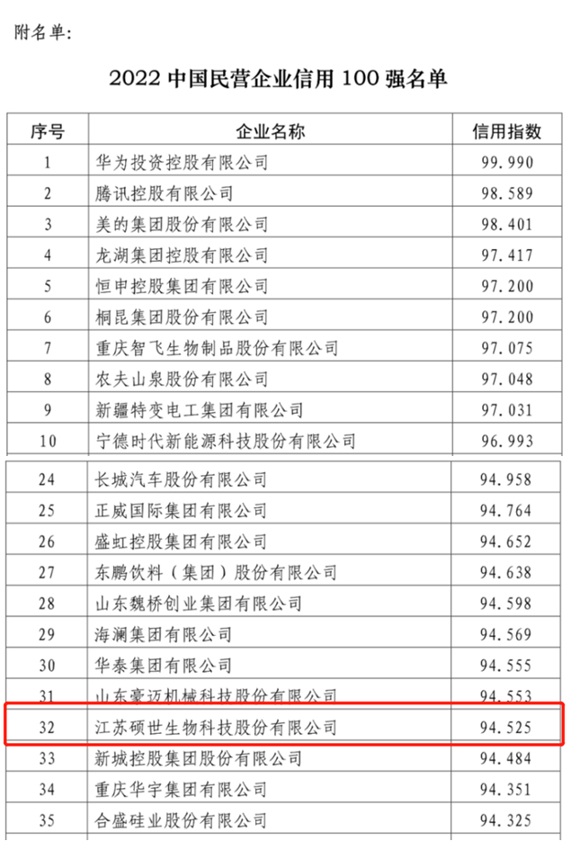值得一提的是,硕世生物位列「2022中国民营企业信用100强」第32位、「2022中国上市企业信用500强」第107位、「2022中国企业信用500强」第130位,守法诚信经营得到高度肯定。