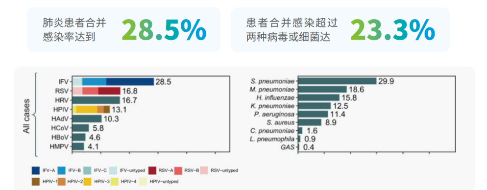 中国疾病预防控制中心(CDC)曾发表在《Nature communications》一项历时11年的急性呼吸道感染(Acute Respiratory Infections,ARIs)监测数据研究显示,我国最常见的病原体是流感病毒(IFV(28.5%),肺炎支原体(18.6%)、呼吸道合胞病毒(RSV)(16.8%)、人鼻病毒(HRV)(16.7%)、人副流感病毒(HPIV)(13.1%)、人腺病毒(HAdV)(10.3%)等,同时肺炎患者合并感染率达28.5%,患者合并感染超过两种病毒或细菌达23.3%,一次7项联合检测主流病原,更快区分临床流感样患者病原类型,实现精准用药、合理诊疗,有效避免抗生素滥用。