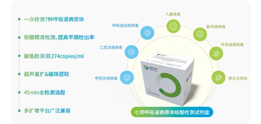 近日,硕世生物自主研发的七项呼吸道病原体核酸检测试剂盒(荧光 PCR 法)正式获批(注册证号:国械注准20253401991)。该产品用于体外定性检测人咽拭子样本中甲型流感病毒、乙型流感病毒、呼吸道合胞病毒、呼吸道腺病毒、副流感病毒、鼻病毒和肺炎支原体。覆盖主流病原,最少够用组合,多场景适配方案助力呼吸道病原防控检测需求。