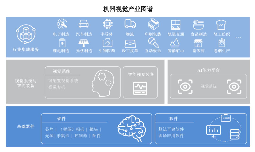 机器视觉以视觉器件、可配置视觉系统和智能视觉装备等形态服务各产业,几乎涵盖了国民经济的各个领域。机器视觉作为人工智能的重要分支,是实现工业自动化和智能化的关键核心技术,也是我国实施智能制造战略的重要支撑。