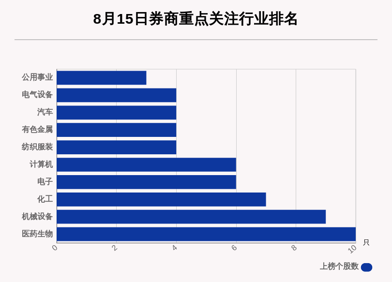 从券商对行业的关注度来看,券商关注个股数居前的行业分别是医药生物、机械设备、化工。