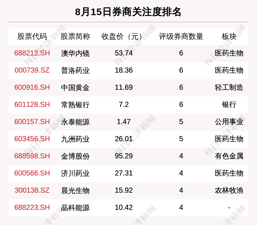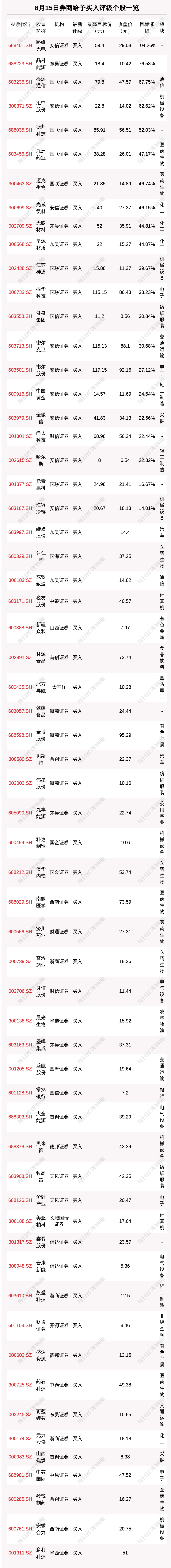8月15日,券商给予评级的个股数共有92只,获得买入评级的个股数共有61只。在公布了目标价格的21只个股中,按照最新收盘价计算,预期涨幅排名居前的个股是路维光电(688401.SH)、晶科能源(688223.SH)、移远通信(603236.SH),预期涨幅分别是104.26%、76.58%、67.75%。