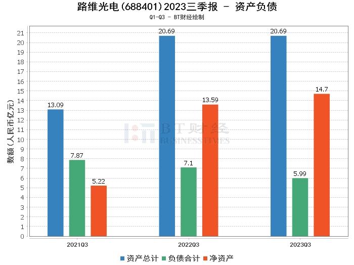 路维光电的2023年三季度财报显示,公司的总资产为20.69亿元,相较于上年度末的19.37亿元有所增长。负债合计为5.99亿元,较上年度末的5.44亿元略有增加。净资产为14.7亿元,较上年度末的13.94亿元有所提升。资产负债率为28.95%,相比上年度末的28.06%略有上升。