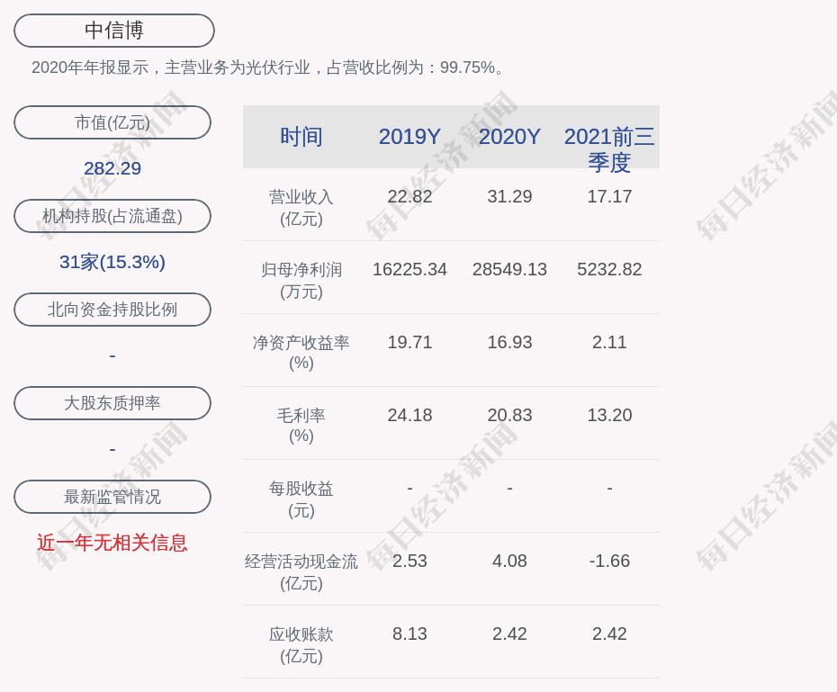2020年年报显示,中信博的主营业务为光伏行业,占营收比例为:99.75%。