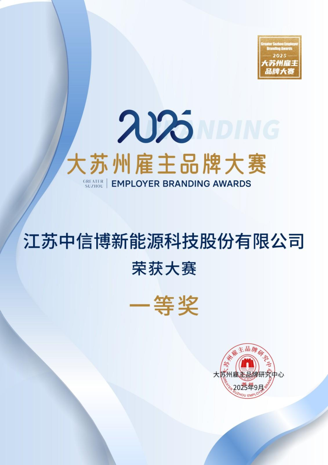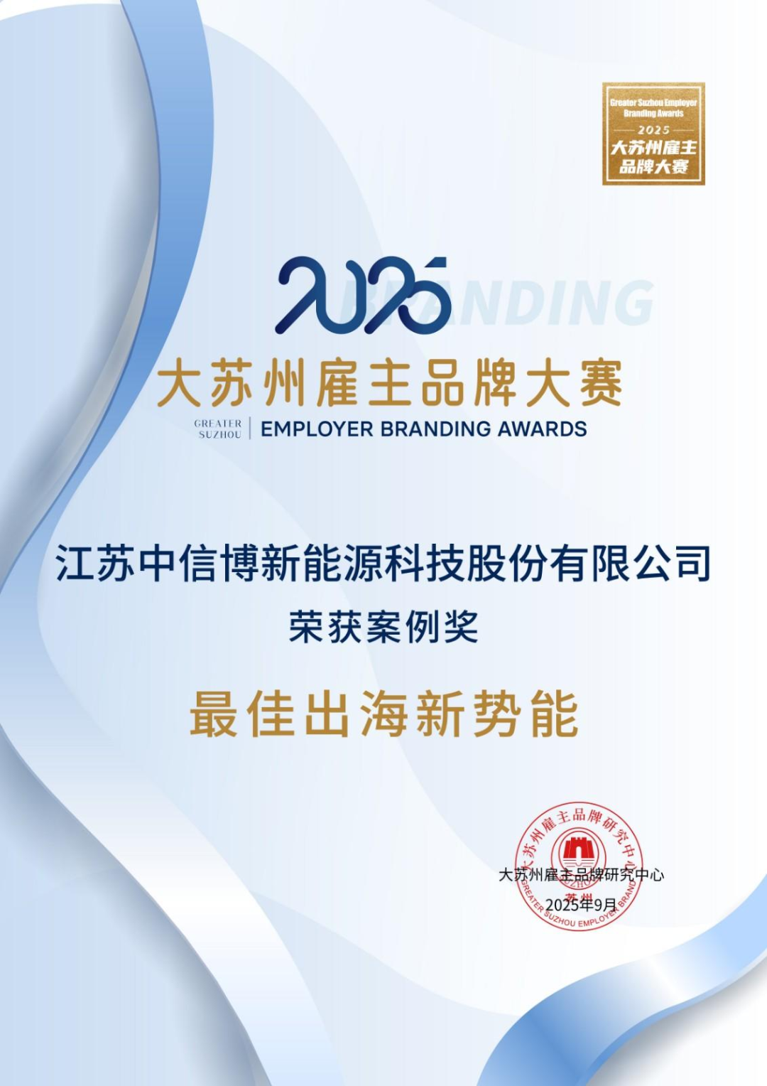 中信博荣膺2025“大苏州雇主品牌大赛一等奖”、“最佳出海新势能”奖,凭借卓越的雇主品牌综合实力于众多企业中脱颖而出,成为苏州地区雇主品牌建设的新标杆。彰显了企业在人才战略与组织发展领域的突出实力。