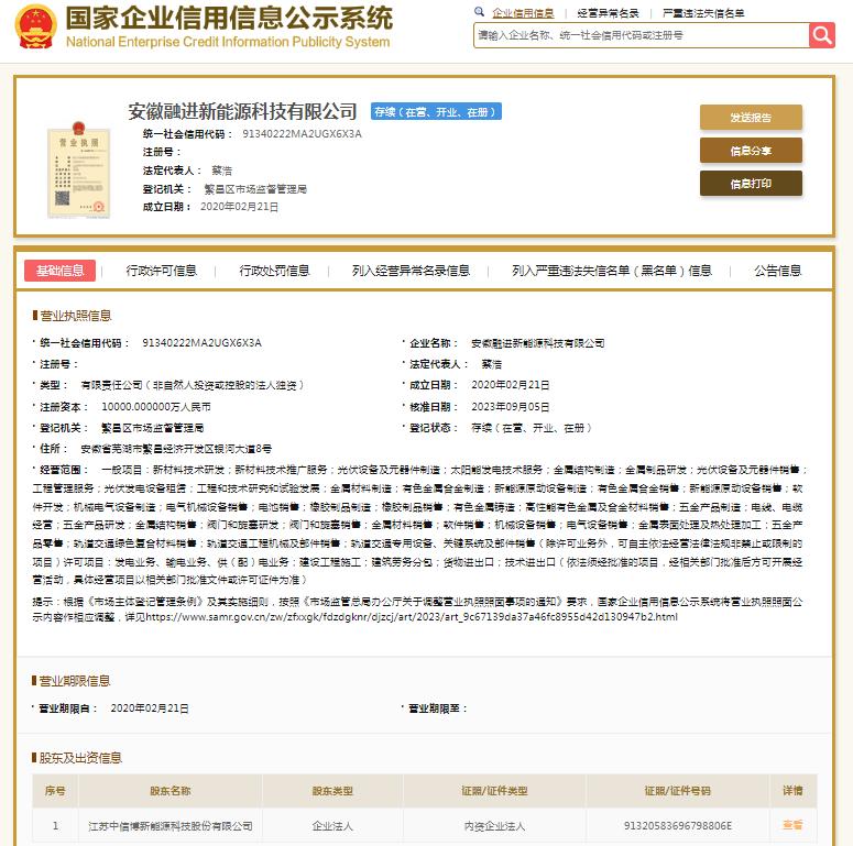国家企业信用信息公示系统显示, 安徽融进新能源科技有限公司 成立于2020年,注册资本10000万元,法定代表人蔡浩。 中信博 (688408.SH)则成立于2009年,注册资本21906.5886万元人民币,法定代表人同为蔡浩。
