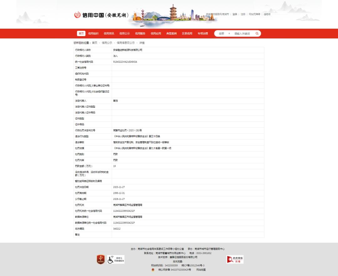 对此,处罚机关依据《中华人民共和国特种设备安全法》第九十条第一款第一项,对其罚款19万元。行政处罚决定书文号:芜繁市监处罚﹝2025﹞281号。
