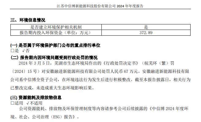 此外,齐鲁晚报·齐鲁壹点记者于 中信博 (688408.SH)2024年年度报告中了解到,融进新能源还曾因环境问题受到行政处罚。据年报披露,2024年3月5日, 芜湖市生态环境局 作出的《行政处罚决定书》(皖芜环(繁)罚〔2024〕15号)对融进新能源处罚人民币67万元。其在环境违法行为发生后进行积极整改。截至该报告披露日,相关行为已整改完成,未造成重大生态环境影响后果。