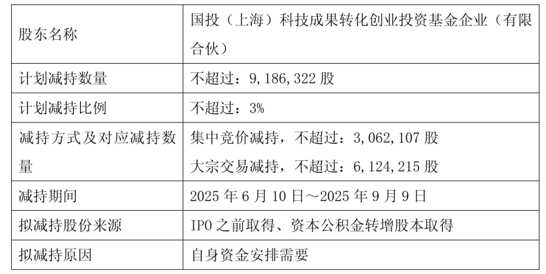截至本公告披露日,国投创业基金持有公司股份3764.60万股,占公司总股本的12.29%,计划减持数量918.63万股,减持比例不超过3%;辽宁中德持有公司股份1480万股,占公司总股本的4.83%,计划减持数量不超过306.21万股,减持比例不超过1%。