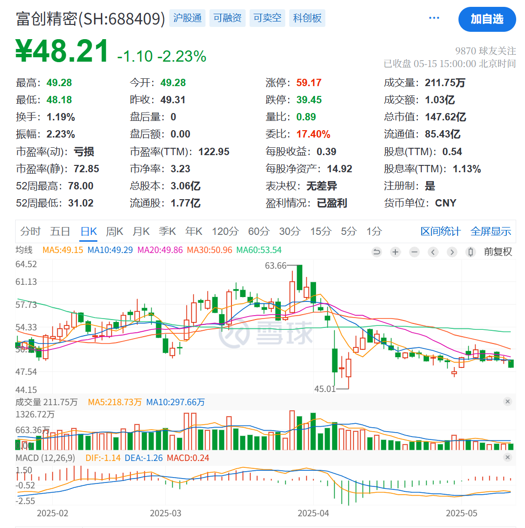 二级市场上,截至5月15日收盘,富创精密下跌2.23%报48.21元/股,最新市值147.62亿元。和2022年10月刚上市时的高位相比,公司股价已跌超48%,曾多次跌破发行价。