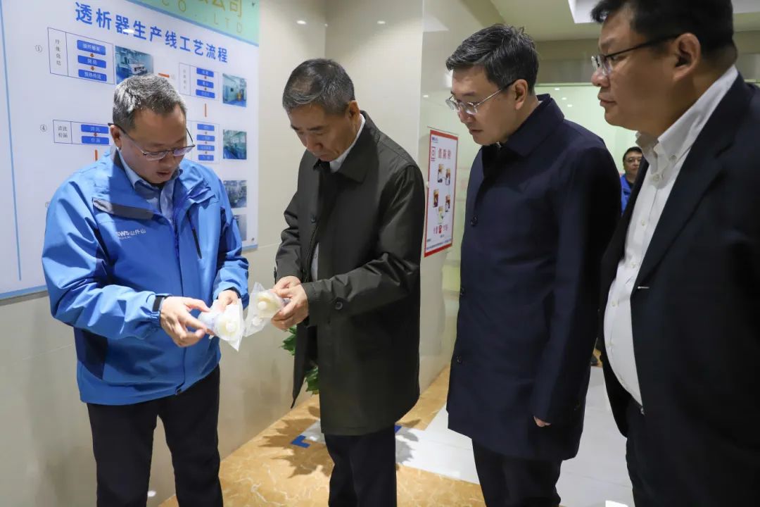 调研过程中,山外山董事长高光勇为辛国斌副部长系统介绍了公司情况,并重点就山外山承接国家重大科技攻关项目,研发血液净化领域新型产品的进展情况进行了汇报,表示各项指标都已按照时间节点高质量完成,即将进入产品注册阶段。