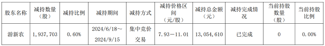 2024年9月,山外山股东游新农通过集中竞价的方式,累计减持公司股份193.77万股,减持股份数量占公司总股本的0.6%,套现1305万元。