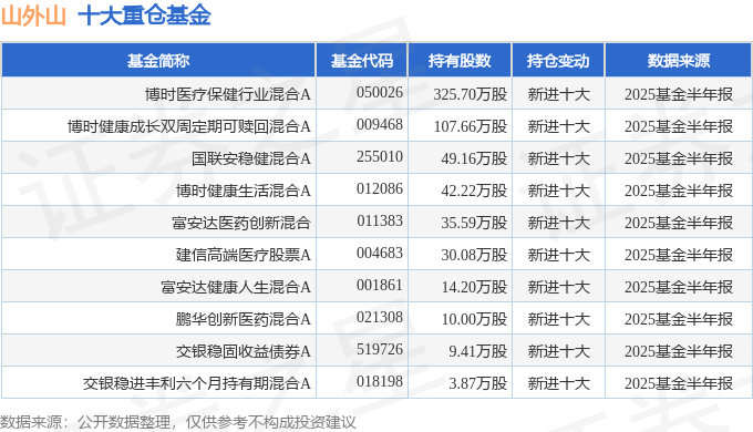 持有山外山最多的基金为博时医疗保健行业混合A,目前规模为20.65亿元,最新净值2.719(8月20日),较上一交易日上涨0.07%,近一年上涨24.72%。该基金现任基金经理为陈西铭。