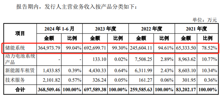 2021年至2023年以及2024年上半年,海博思创的营业收入分别为8.38亿元、26.26亿元、69.82亿元、36.87亿元。其主营业务收入主要来源于储能系统的生产和销售。海博思创储能系统的收入分别为6.53亿元、24.56亿元、69.27亿元和36.5亿元,占主营业务收入比重分别为78.52%、94.61%、99.30%和99.04%。