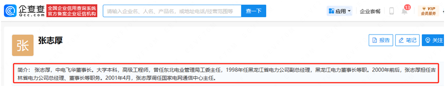 北京中电飞华通信有限公司曾有一位名为“张志厚”的董事长。其简介为,大学本科,高级工程师,曾任东北电业管理局工委主任,1998年任黑龙江省电力公司副总经理,黑龙江电力董事长等职。2000年前后,张志厚担任吉林省电力公司总经理、董事长等职务。2001年4月,张志厚调任国家电网通信中心主任。
