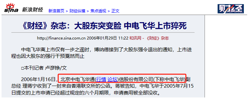 值得一提的是,北京中电飞华通信有限公司曾用名为“北京中电飞华通信股份有限公司”(下称“中电飞华”)。据《财经》杂志2006年1月的报道称,“中电飞华离上市仅有一步之遥时,博纳德(原“博纳德投资有限公司”、已注销)接到了大股东强令退出的通知,上市进程也因大股东的强行干预戛然而止。中电飞华是一家以经营电力通信及增值电信业务为主的公司,是国内目前最大的电力通信网络运营商,注册资金1.05亿元人民币。公司第一大股东为国家电网公司,它通过国电通信中心、国电通网络技术公司、中电财务公司等持有中电飞华67.31%的股权。国电通信中心主任张志厚任中电飞华董事长。”