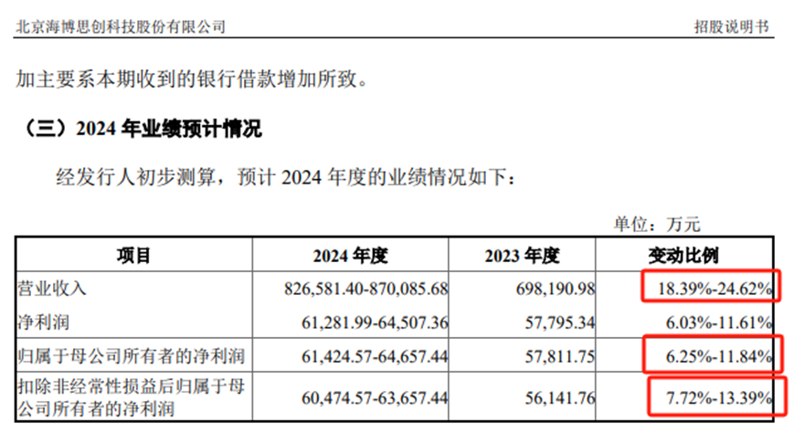 所以尽管招股书显示,海博思创2024年前三季度营业收入为51.98亿元,同比增长20.4%。其归母净利润为3.13亿元,同比增长77.36%。但海博思创在招股书中预计,其2024年全年归母净利润为6.14亿元至6.47亿元,只同比增长6.25%至11.84%。