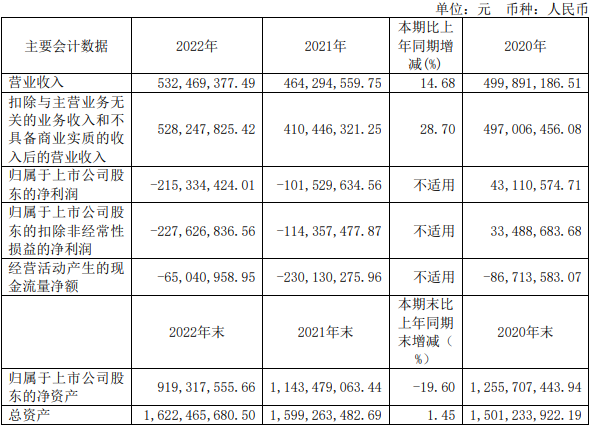 2022年,震有科技实现营业收入5.32亿元,同比增长14.68%;实现归属于上市公司股东的净利润-2.15亿元,上年同期为-1.02亿元;实现归属于上市公司股东的扣除非经常性损益的净利润-2.28亿元,上年同期为-1.14亿元;经营活动产生的现金流量净额-6504.10万元,上年同期为-2.30亿元。