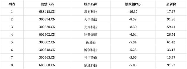 今日早盘,截至10:00,通信设备板块下挫。震有科技(688418.CN)跌16.37%报17.27元,天孚通信(300394.CN)跌8.32%报91.96元,光库科技(300620.CN)跌8.30%报59.41元,铭普光磁(002902.CN)跌6.04%报26.74元,新易盛(300502.CN)跌5.94%报61.42元,博创科技(300548.CN)跌5.23%报33.17元,神宇股份(300563.CN)跌5.06%报15.77元,鼎通科技(688668.CN)跌5.05%报91.23元。