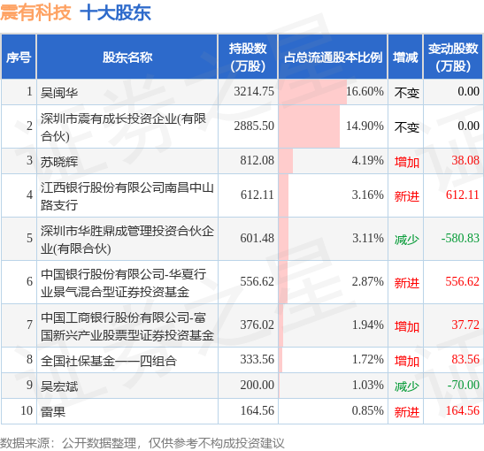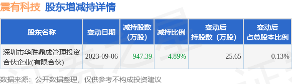 10月13日震有科技发布公告《震有科技:关于持股5%以上股东减持股份结果公告》,其股东深圳市华胜鼎成管理投资合伙企业(有限合伙)于2023年4月20日至2023年9月6日间合计减持947.39万股,占公司目前总股本的4.8933%,变动期间该股股价上涨8.32%,截止9月6日收盘报19.66元。