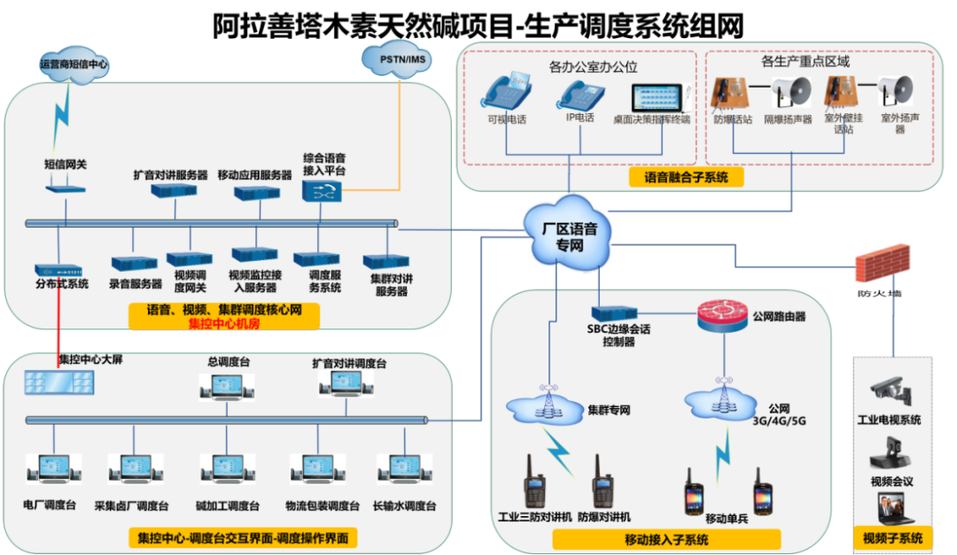 系统采用音视频融合指挥调度系统架构,以语音交换、视频会商为核心,通过开放接口支持多种语音网络、语音终端、多种视频系统的全连接,将总控中心与热电厂、采集卤厂、碱加工厂、物流包装厂、长输水厂的办公电话、调度电话、PDT集群系统、广播系统、防爆扩音对讲系统、单兵APP、工业电视系统、视频会议系统等不同系统设备进行整合互通并实现融合调度。为企业打造包含:行政办公电话系统+调度电话系统+扩音对讲系统+电梯应急对讲系统+无线调度系统+工业电视系统+GIS调度系统+多媒体调度系统等多方位全融合的多点、多级调度系统。