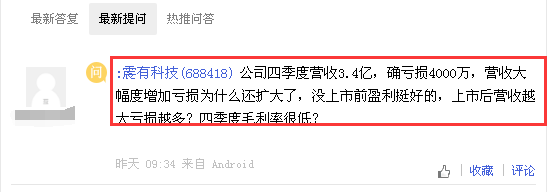 针对上市以来,盈利的大幅下滑直至亏损,有投资者近日提出质疑:“公司四季度营收3.4亿,确亏损4000万,营收大幅度增加亏损为什么还扩大了,没上市前盈利挺好的,上市后营收越大亏损越多?四季度毛利率很低?”