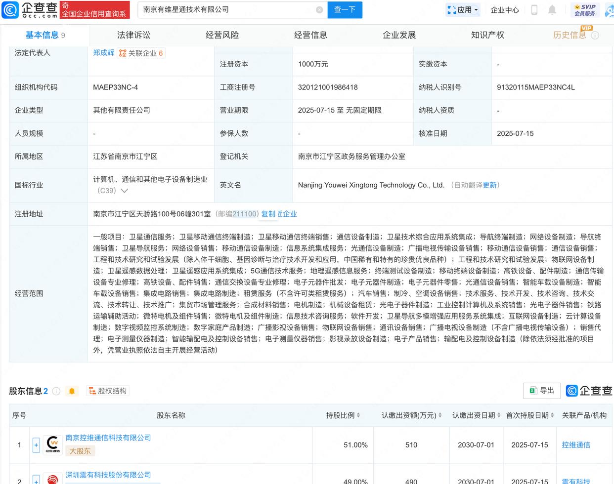 近日,南京有维星通技术有限公司成立,注册资本1000万元,经营范围包含:卫星通信服务;卫星移动通信终端制造;卫星移动通信终端销售;通信设备制造等。股权穿透显示,该公司由震有科技(688418)等共同持股。