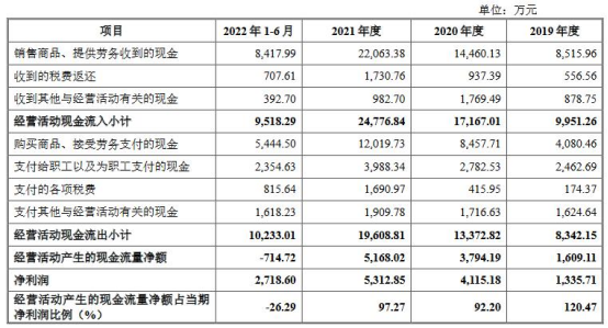 2019年至2021年,耐科装备销售商品、提供劳务收到的现金分别为8,515.96万元、14,460.13万元、22,063.38万元、8,417.99万元,经营活动产生的现金流量净额1,609.11万元、3,794.19万元、5,168.02万元、-714.72万元。