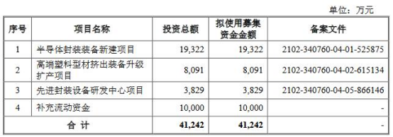 耐科装备本次发行募集资金总额为77,592.50万元;扣除发行费用后,募集资金净额为70,133.13万元。耐科装备最终募集资金净额比原计划多28,891.13万元。2022年11月2日,耐科装备发布的招股书显示,公司拟募集资金41,242万元,分别用于半导体封装装备新建项目、高端塑料型材挤出装备升级扩产项目、先进封装设备研发中心项目、补充流动资金。