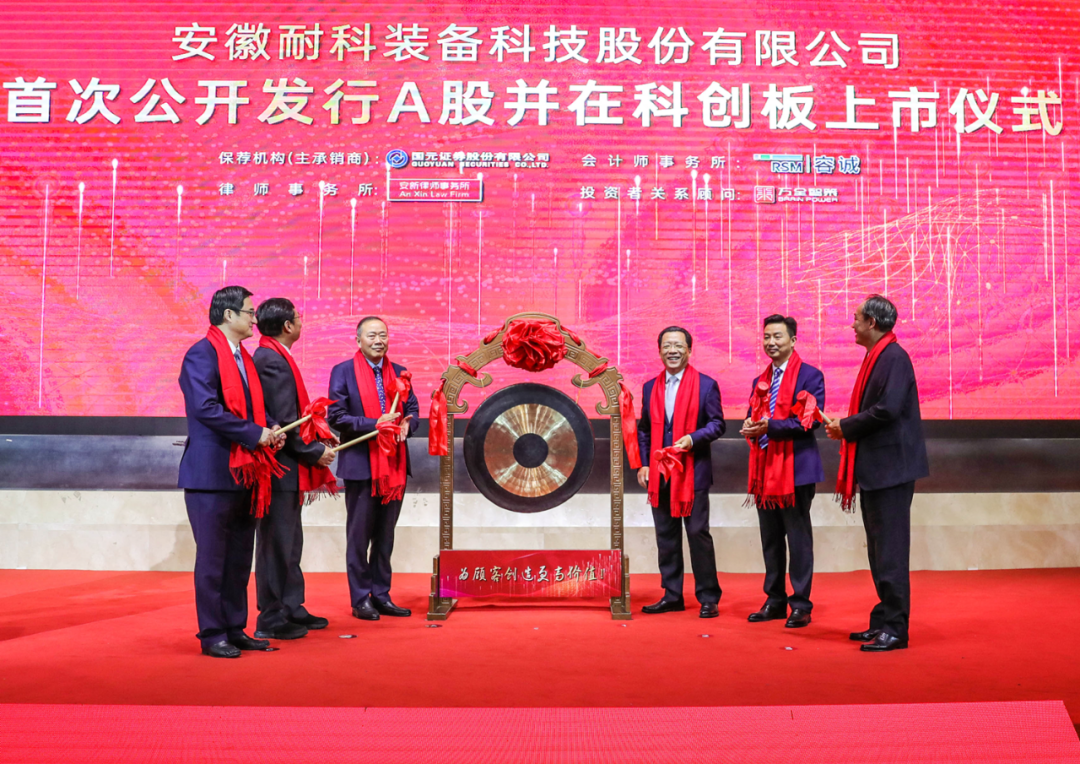 11月7日上午,安徽耐科装备科技股份有限公司首次公开发行A股并在科创板上市仪式举行。市领导丁纯、何田、马军,老干部唐世定,省地方金融监管局副局长程钢,国元证券党委书记、董事长俞仕新,耐科装备科技股份有限公司负责人等出席仪式。
