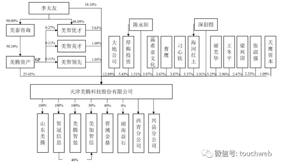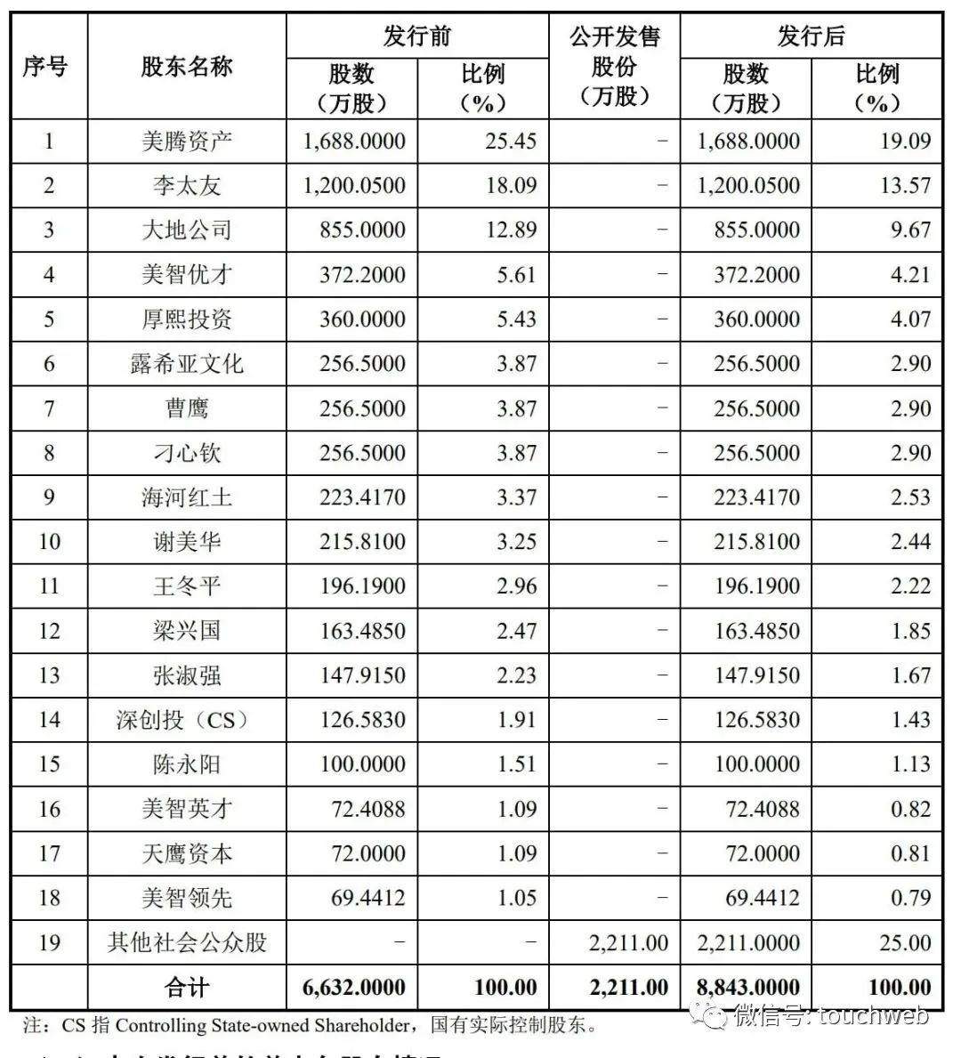 IPO后,美腾资产持股为19.09%,李太友持股为13.57%,大地公司持股为9.67%,美智优才持股为4.21%,厚熙投资持股为4.07%;
