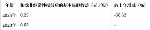 扣除非经常性损益后的基本每股收益为0.25元/股,2023年为0.63元/股,同比下降60.32%。这进一步表明公司扣除非经常性损益后的盈利能力下降明显。